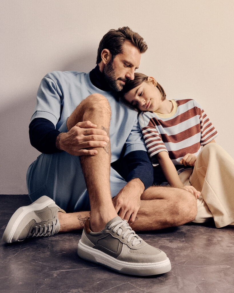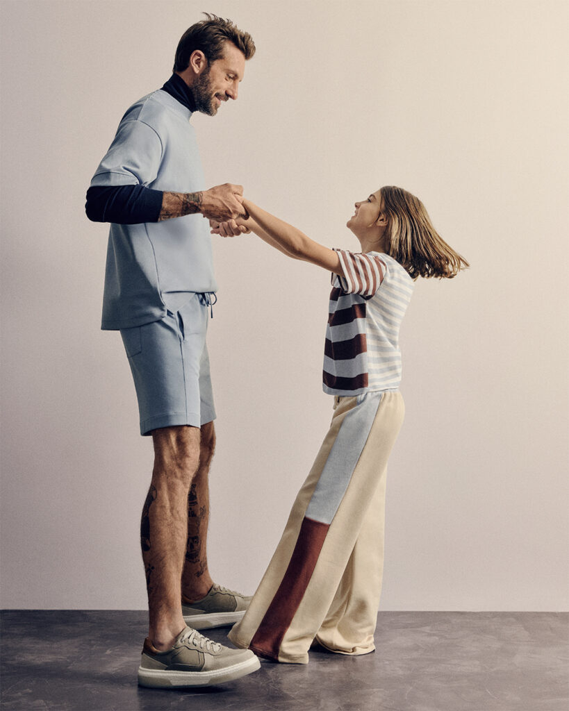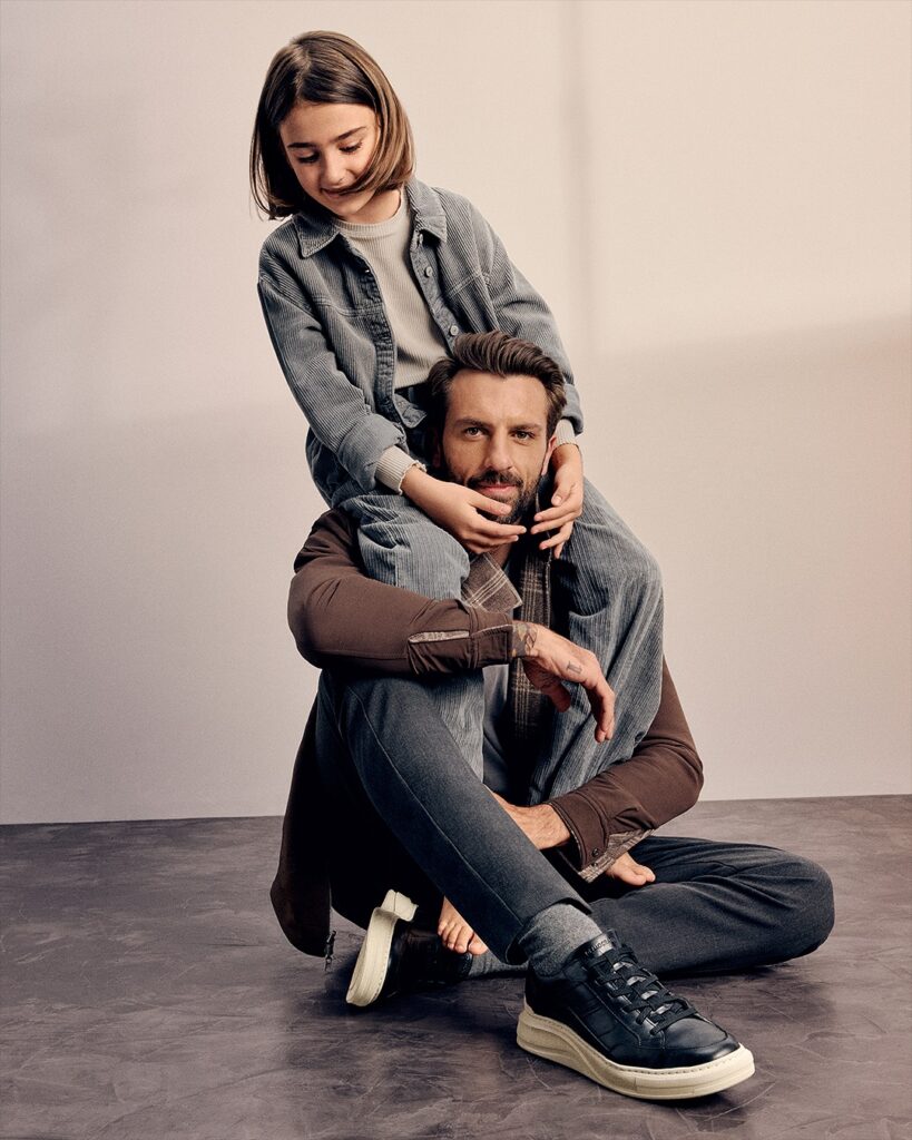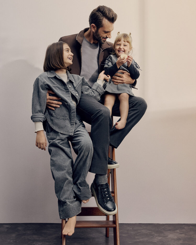 Rafael Lazzini e suas filhas Lis e Maia, em fotos de Jorge Ewald (Group Art), vídeo de Felipe Terra (mbgs.cc), direção criativa de Estúdio no.302, styling de Karine Vilas Boas (Ivy Faria), beleza de Helder Rodrigues (Capa MGT) e produção executiva de Due Produções, na campanha de Dia dos Pais 2025 da grife Democrata.