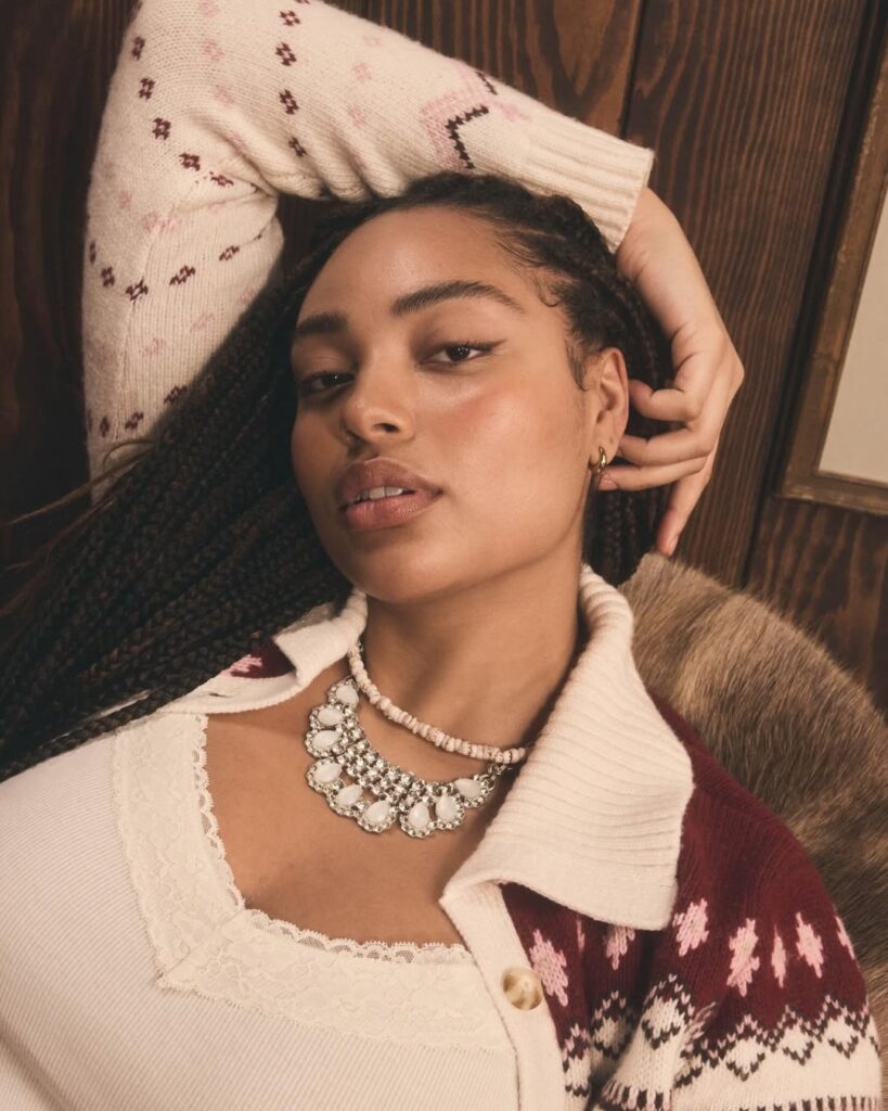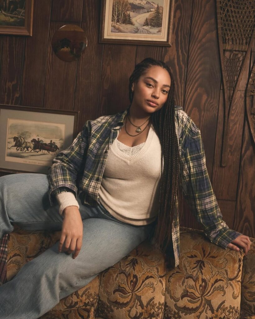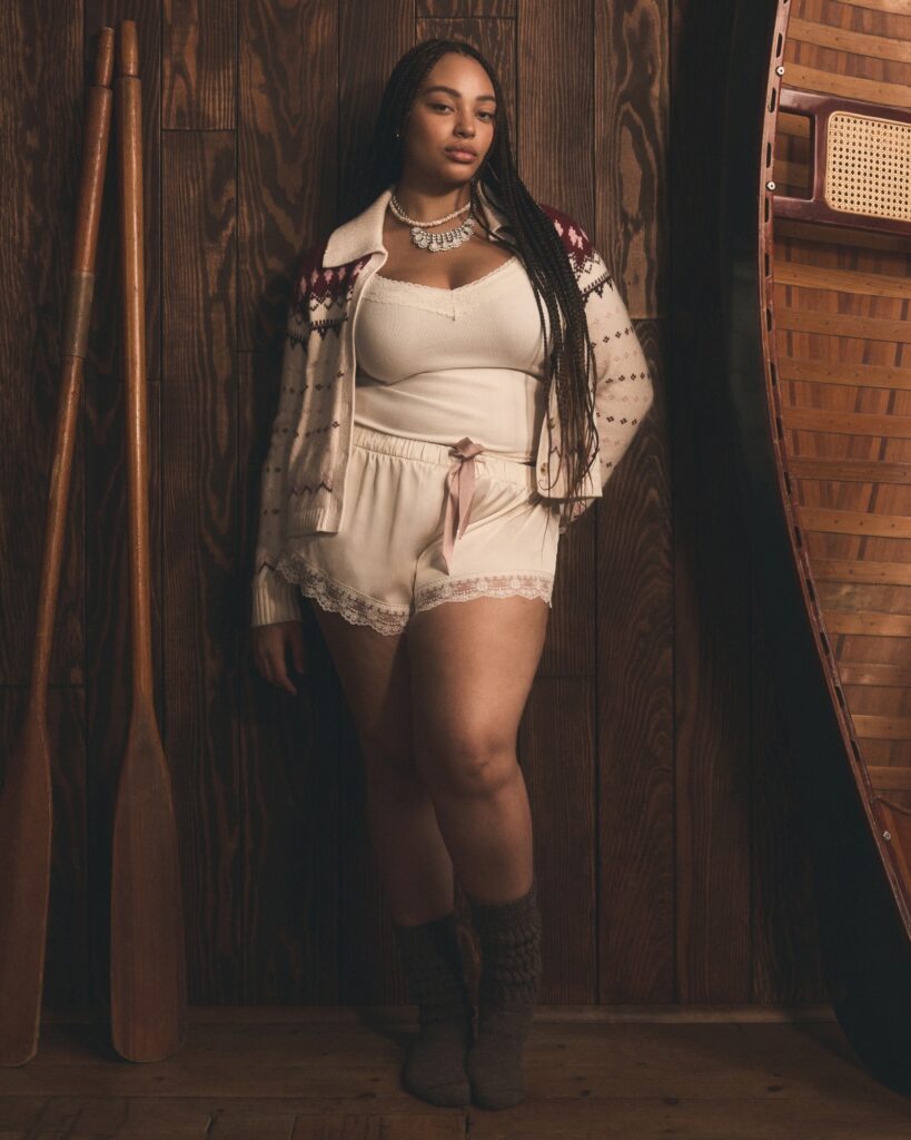 Lindsey Hilario, em fotos de Heather Hazzan, direção criativa de John McLean, styling de Brittny Moore, cabelo de Jenny Kim, maquiagem de Tami Wells, manicure Mel Shengaris, cenografia de Bette Adams e produção executiva de Portfolio One, na campanha de Holiday 2025 da coleção Archive da grife Abercrombie & Fitch.